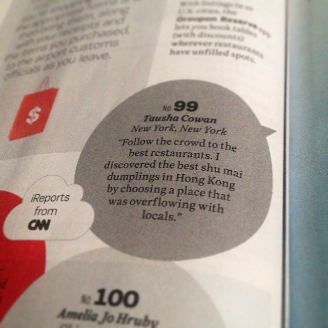 A few months ago, I submitted a few travel tips to Travel + Leisure/CNN iReport’s “100 Ways to Travel Better” special, one of which ended up being featured in the December 2013 issue of Travel + Leisure magazine. The tip was based on my first night in Hong Kong, where I had arrived solo for a few days of exploring. I had landed in HK late on a Wednesday night in early March 2013 and, after getting on the MTR train and dropping my bag off at my hotel in Causeway Bay, I wandered over to Jardine’s Bazaar at the recommendation of the hotel concierge to see about some food. It was nearing midnight and yet a ton of people were out and about, going from one place to the next at a rapid pace typical of Hong Kongers. With no idea where to go or what to eat, I walked from restaurant to restaurant until I spotted a place filled with locals. I had always been taught to “follow the locals” when it comes to dining in a different country since they know where good food can be found. It turns out I was right; I ended up at an excellent noodle shop where I indulged in some delicious shu mai dumplings with noodles. It was my first dining experience in Hong Kong and one of my most enjoyable, so much so that I ended up there again on my last night in HK. So, there’s my tip: follow the crowd to the best restaurants. I promise you won’t regret it.